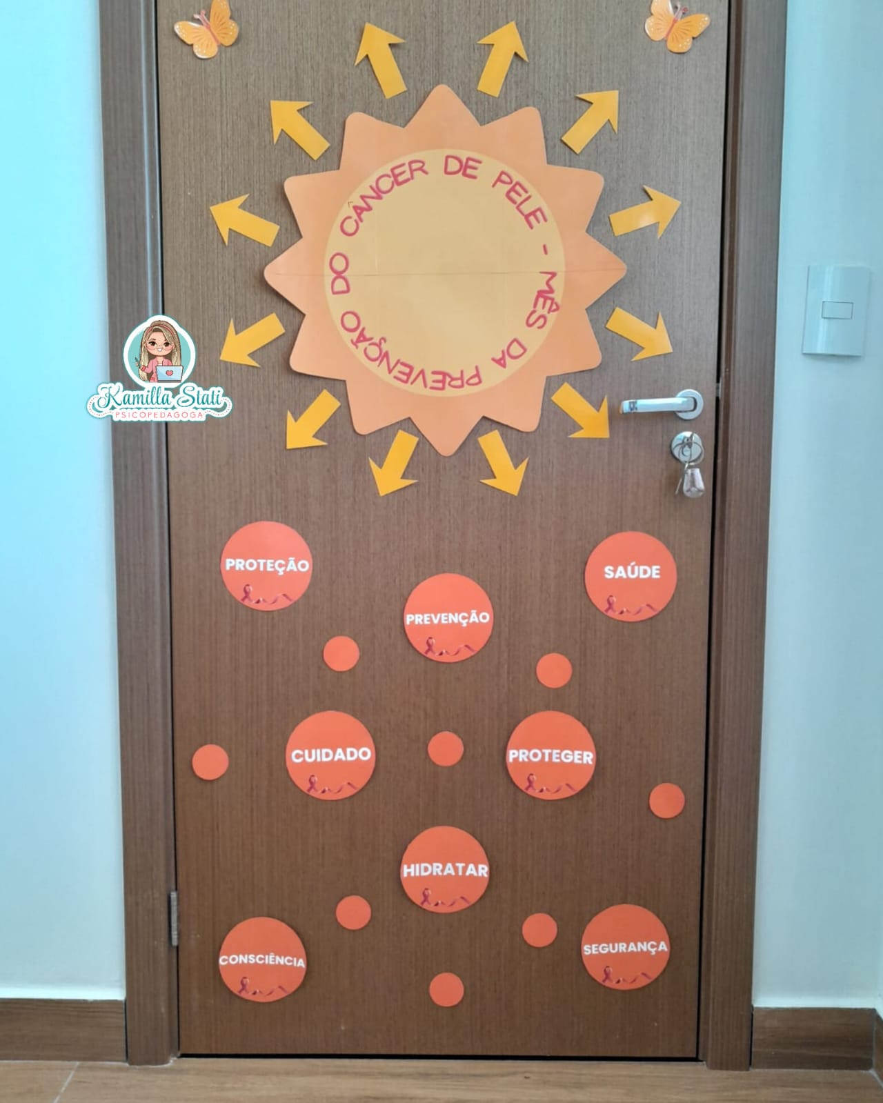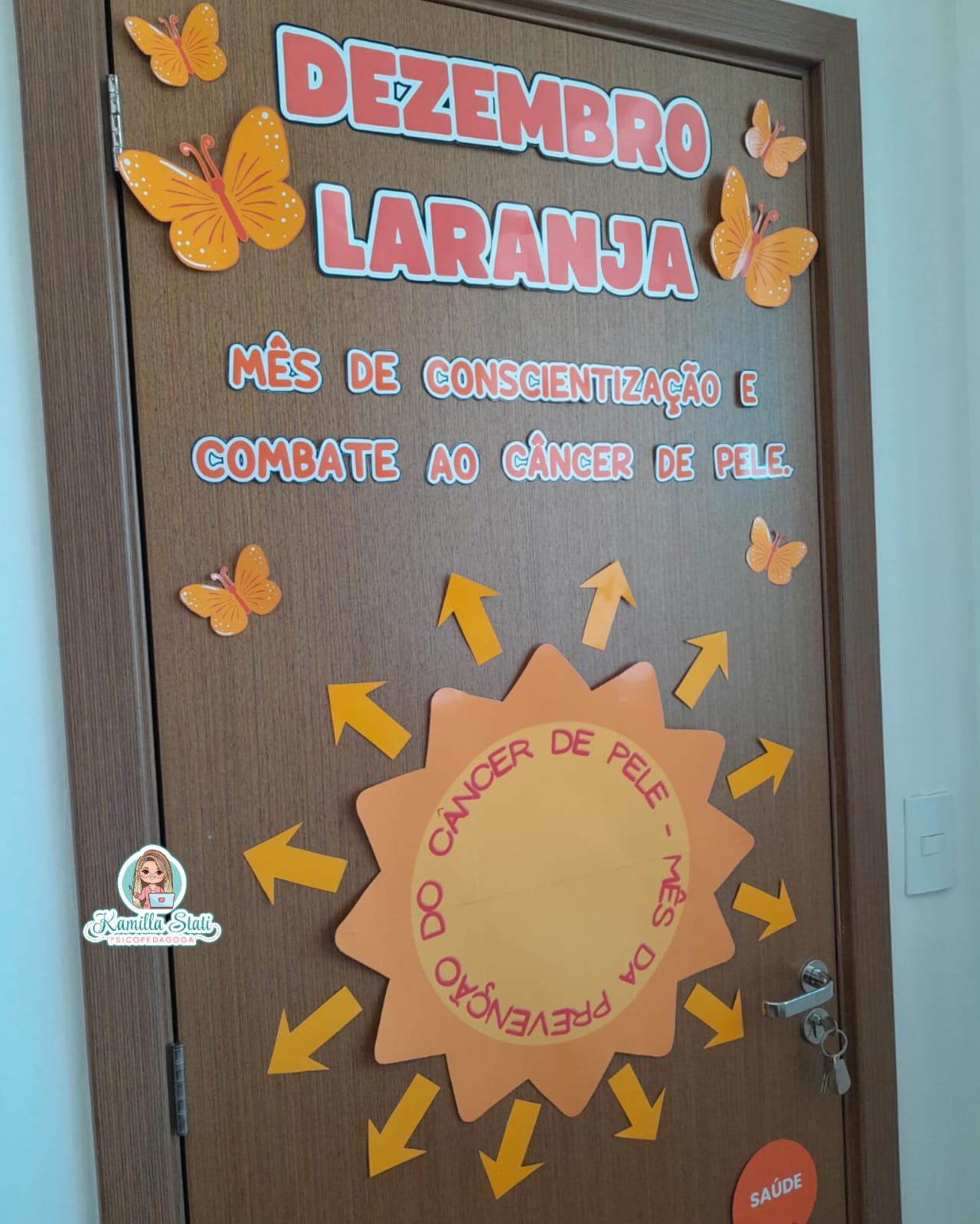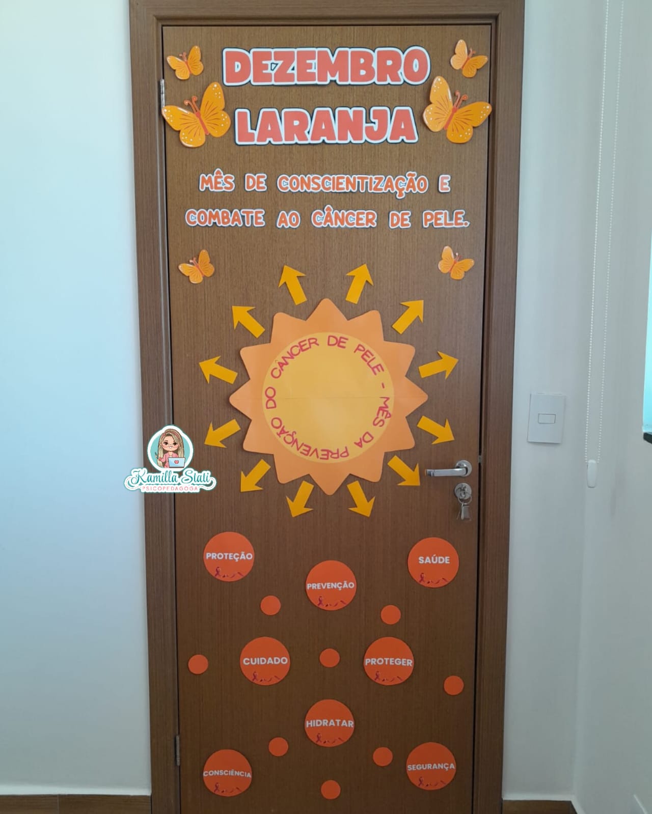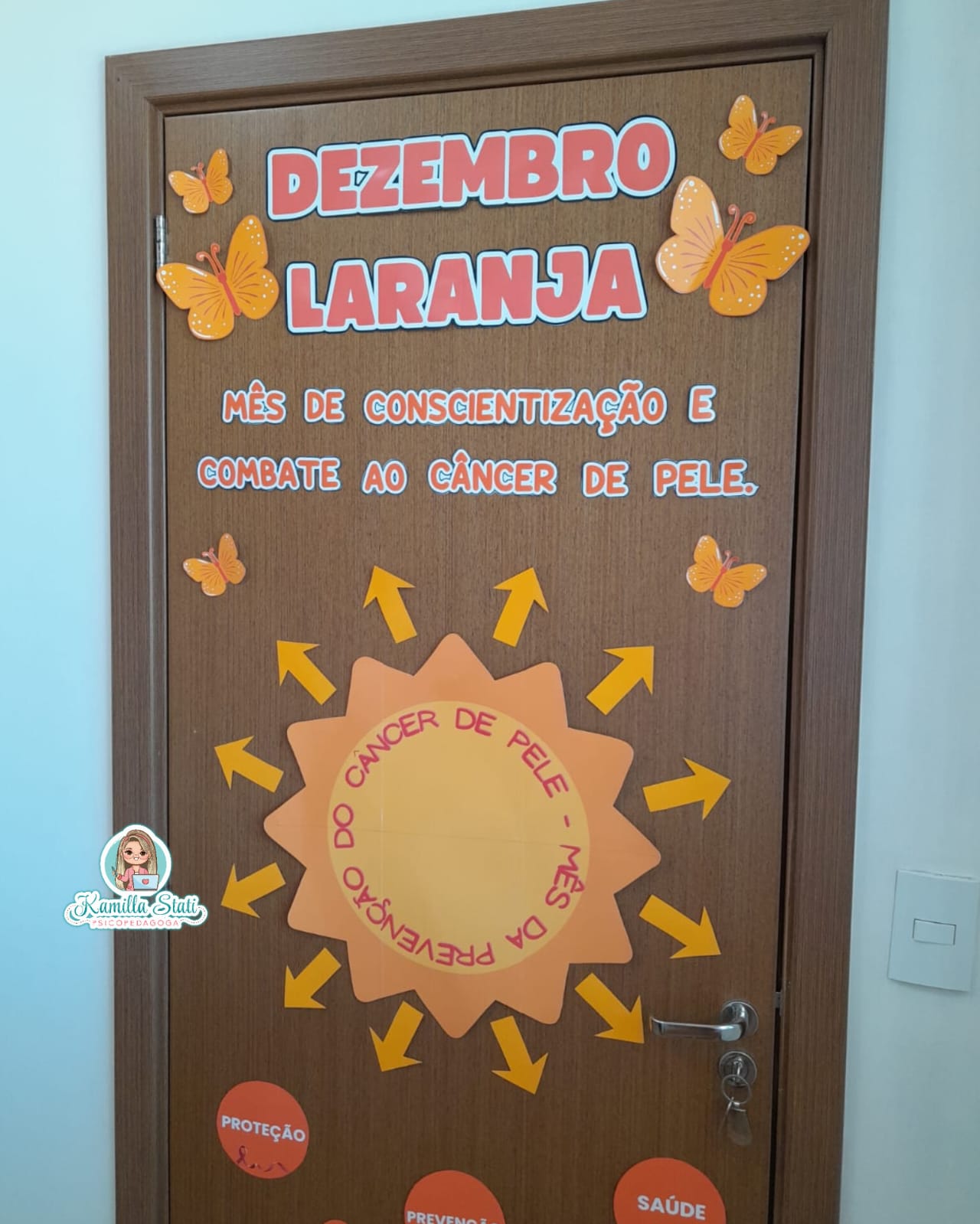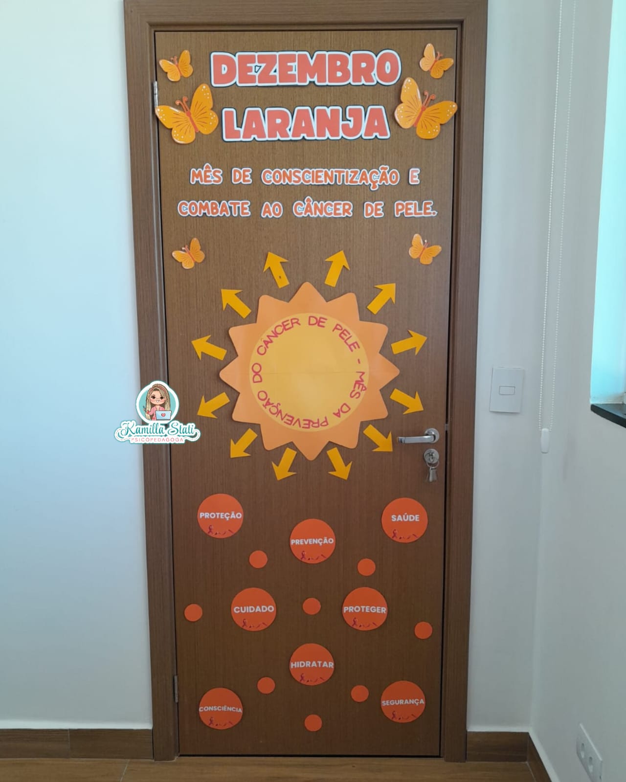 O Dezembro Laranja é o mês dedicado à conscientização e prevenção do câncer de pele, reforçando a importância da proteção solar, do cuidado diário e do diagnóstico precoce. Essa decoração transforma a porta em um espaço educativo, acolhedor e visualmente impactante, incentivando conversas e ações preventivas. ✨